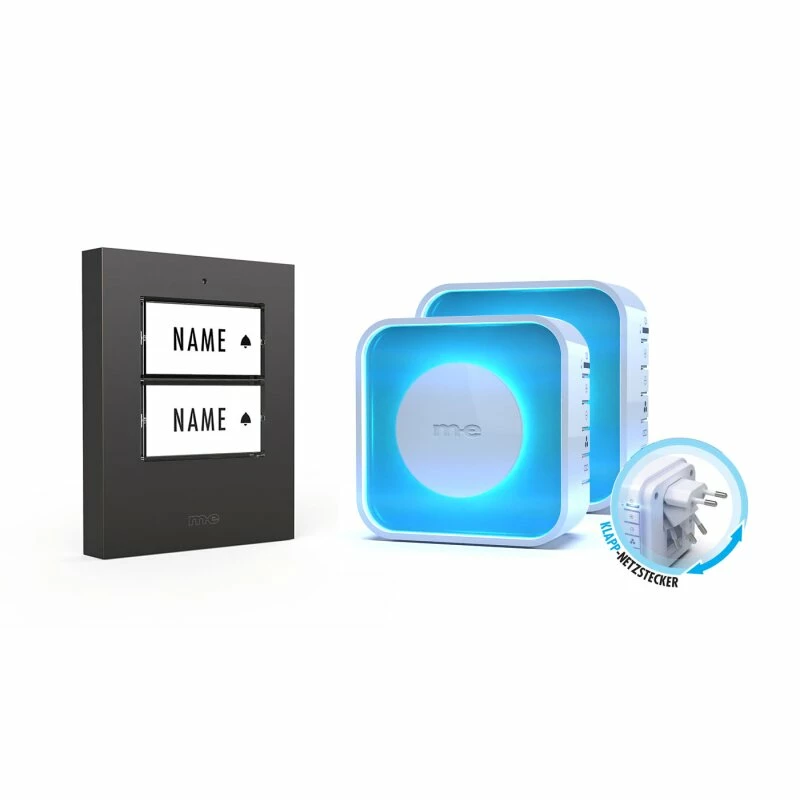 2 Familien Funk-Klingeltaster in der Farbe anthrazit. Mehr Power- Sie benötigen eine Funk-Türglocke, die durch mehrere Stockwerke und Wände funktioniert? Kein Problem – die neue Serie kann Entfernungen von bis zu 500 Metern im Freifeld überbrücken. Darüber hinaus stehen in der neuen Generation nun 16 Klingeltöne zur Auswahl.