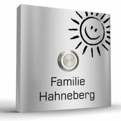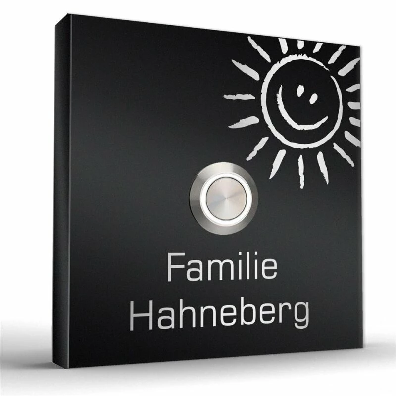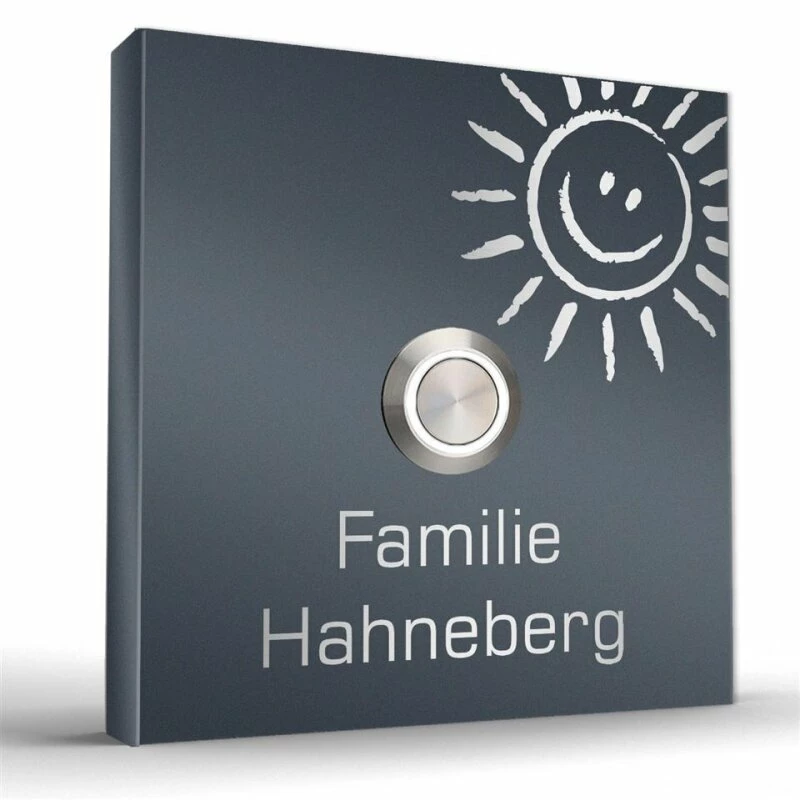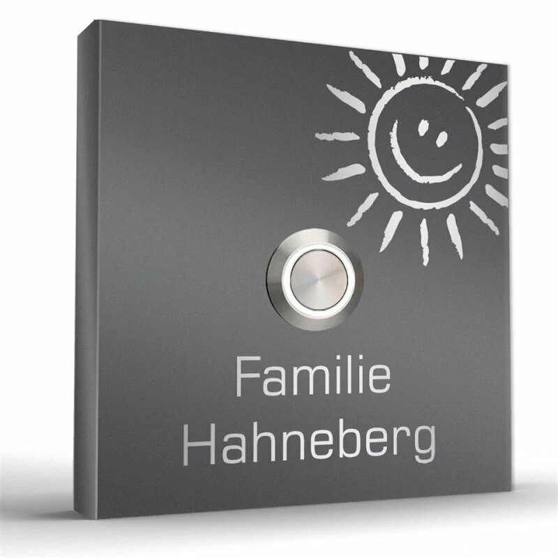 Diese fröhliche Türklingel macht einfach gute Laune. Sie ist ideal für Einfamilienhäuser geeignet, in denen Familien leben, die Sonne im Herzen haben. Und auf ihrer Haustürklingel eben – denn auf der pulverbeschichteten Oberfläche ist eine lachende Sonne eingraviert. Die Klingelplatte besteht aus hochwertigem, pulverbeschichteten Edelstahl. Ihr Familienname wird über eine CO2-Lasergravur eingebracht. Sie ist wetterfest und UV-beständig.