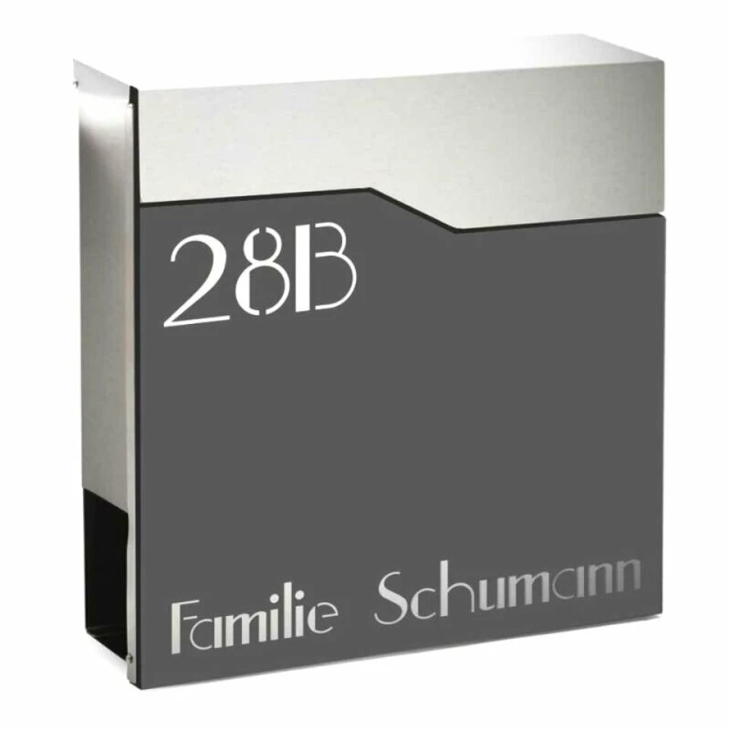 Design Briefkasten mit Lasercut Beschriftung aus Edelstahl – anthrazit RAL 7016 pulverbeschichtet – mit silberner Klappe – Qualitätsprodukt – Wetterfester Premium Briefkasten. Einwurfklappe mit Geräuschdämmung. Die Beschriftung erfolgt im Lasercutverfahren und ist vertieft ausgelasert.