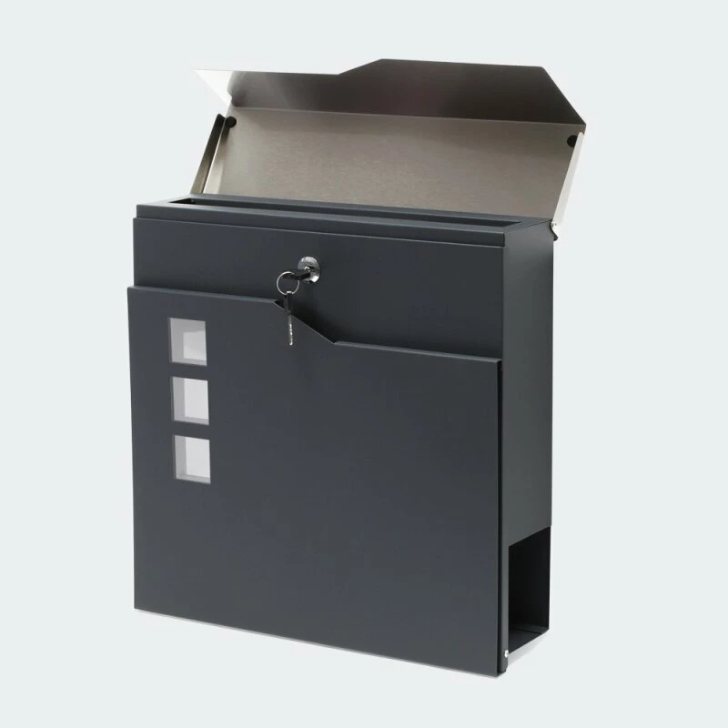 Designer Briefkasten aus galvanisiertem Stahl mit pulverbeschichteter Oberfläche in zeitlos schicker Optik. Der Briefkasten verfügt über einen großen Briefschlitz, so dass auch größere Sendungen eingeworfen werden können. Montage-Material ist ebenfalls im Lieferumfang enthalten. Weiter befindet sich auf der unteren Seite ein Zeitungsfach, so dass Zeitungen nicht mehr vor der Haustüre im Nassen abgelegt werden müssen, sondern einen trockenen Platz haben, bis sie ins Haus geholt werden.