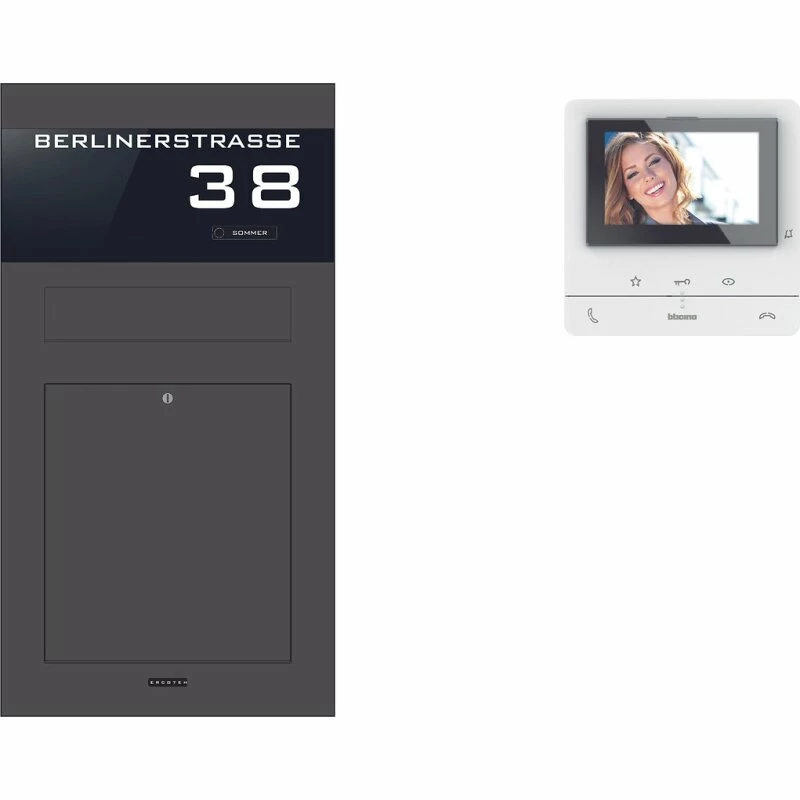 Unterputzbriefkasten TSU 600 mit intergrierter Video-Türsprechanlage von Bticino. Briefkasten Komplettset inkl. einer Video Innenstation Classe 100 X16E Farbe mit Smartphone Kommunikation und vielen weiteren Funktionen (siehe Fotos). Hochauflösende Kamera Weitwinkel 160° Nachtsichtfunktion mit Nachtsicht-LED-s. Briefkasten gefertigt aus 6mm Aluminium und oder +1 mm Edelstahl. Pulverbeschichtung in Wunschfarbe oder gebürsteter Edelstahl. LED hinterleuchtete Straße und Hausnummer. Klingeltaster mit persönlicher hinterleuchteter Gravur. ERCOTEH Schnapp-Montagesystem keine sichtbaren Schrauben in der Frontplatte. Unterputzkasten in 10 cm (auf Wunsch erweiterbar). Die Videosprechanlage ist beliebig erweiterbar mit zusätzlichen Kameras, Türstationen und Innenstationen. Einfache Installation durch vollwertige 2-Drahttechnik die auch mit normalem Klingeldraht funktioniert. Ersatzteilesicherheit durch Markenelektronik.