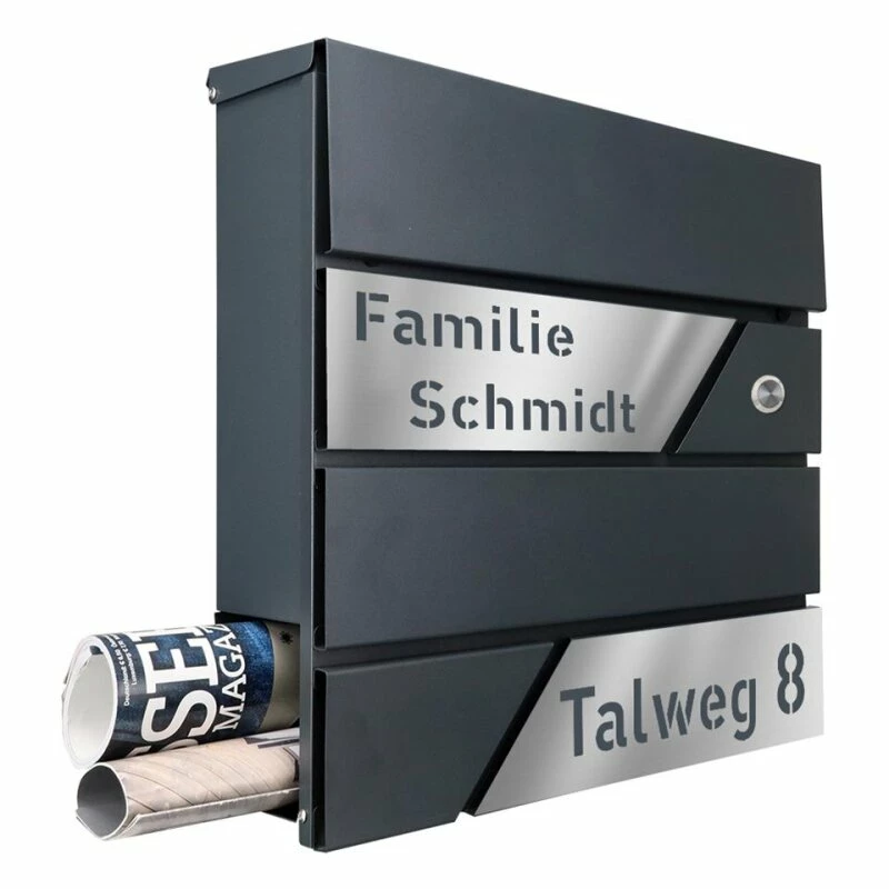 Designer Funk Briefkasten der Besonderen Art aus beschichtetem Stahl in zeitlos schicker Optik. Der Briefkasten verfügt über einen großen Briefschlitz, ist abschließbar und wird mit zwei Schlüsseln geliefert. Montagematerial ist ebenfalls im Lieferumfang enthalten. Weiter befindet sich auf der unteren Seite ein Zeitungsfach, so dass Zeitungen nicht mehr vor der Haustüre im Nassen abgelegt werden müssen, sondern einen trockenen Platz haben, bis sie ins Haus geholt werden. Die Beschriftung erfolgt im Lasercut-Verfahren und ist ein echtes Highlight.