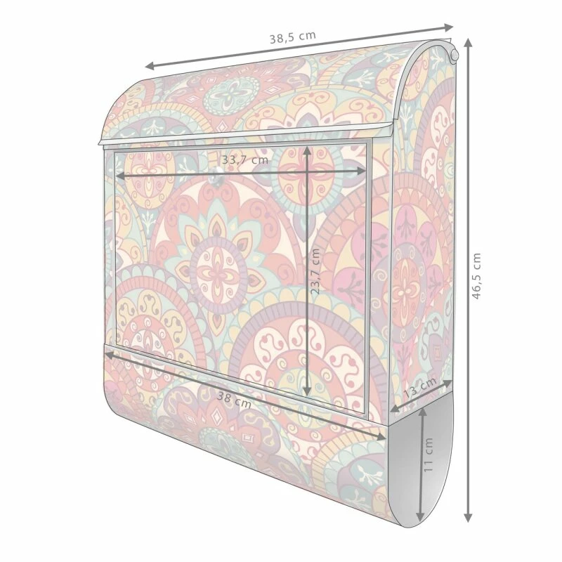 Der Postkasten mit Motiv Rosetten hat ein sehr ansprechendes und ausgefallenes Design, damit entlocken Sie Ihren Nachbarn und dem Postboten ein Lächeln. Heben Sie Sich von der tristen grauen Masse ab, ohne auf Funktionalität zu verzichten.