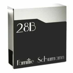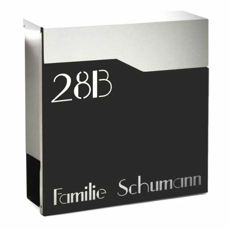 Design Briefkasten mit Lasercut Beschriftung aus Edelstahl – schwarz RAL 9005 pulverbeschichtet – mit silberner Klappe – Qualitätsprodukt – Wetterfester Premium Briefkasten. Einwurfklappe mit Geräuschdämmung. Die Beschriftung erfolgt im Lasercutverfahren und ist vertieft ausgelasert.