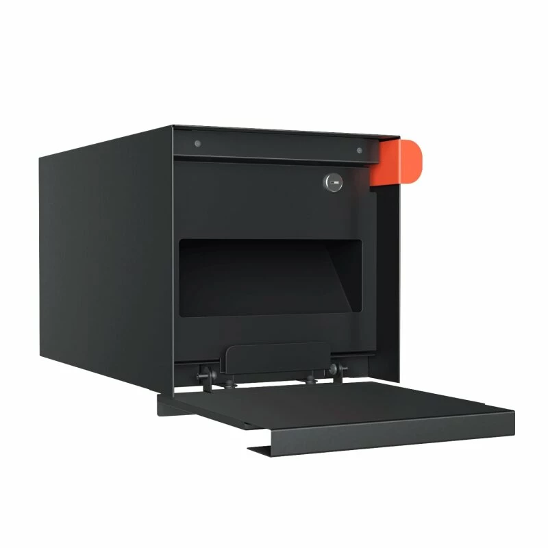 Einwurf und Entnahme erfolgen an der Vorderseite über eine massive Frontklappe und ein dahinterliegendes Innentor mit integriertem Einwurfschlitz und Schloss. Das Besondere: Der eingriffsichere Schlitz ermöglich den Einwurf kleiner Päckchen. Die massive Frontklappe schützt das Innentor vor Witterung und lässt sich als stilistisches Element individuell gestalten.