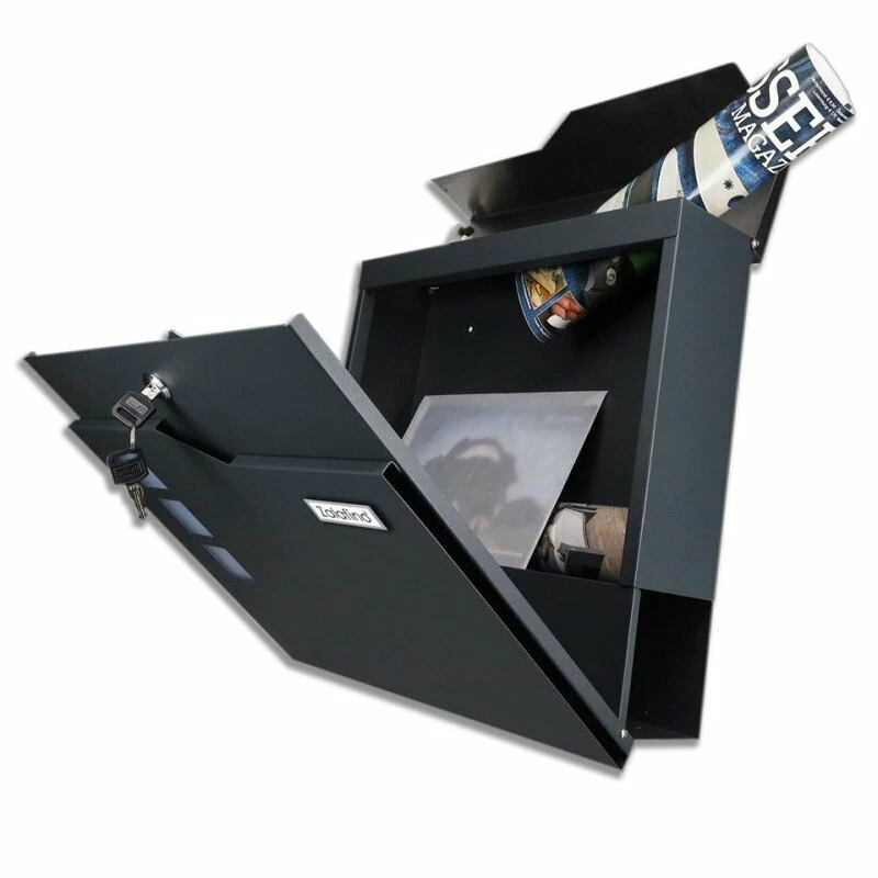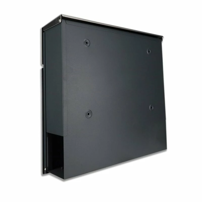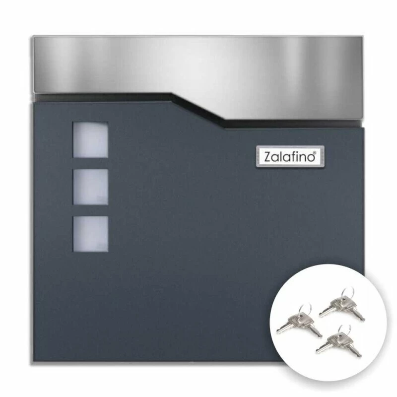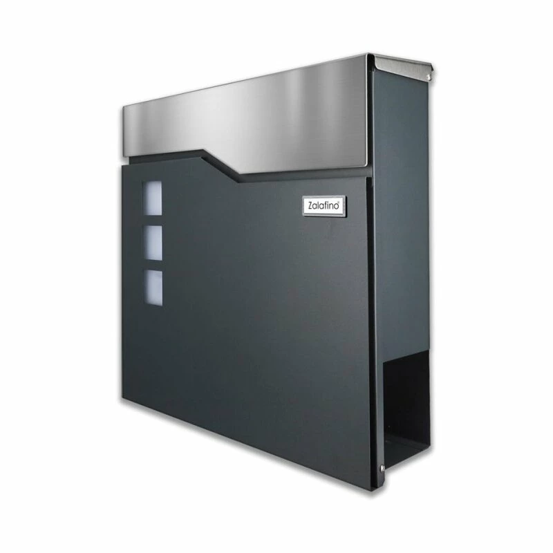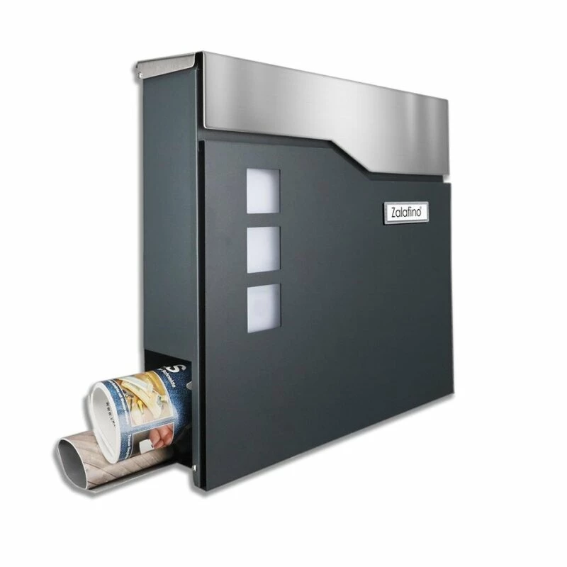 Briefkasten in RAL 7016 Anthrazit Grau Feinstruktur pulverbeschichtet – modernes und zugleich elegantes Design zeichnen diesen Toppseller aus dem Hause Zalafino aus. Der Briefkasten verfügt über einen großen Briefschlitz, so dass auch größere Sendungen eingeworfen werden können. Montage-Material ist ebenfalls im Lieferumfang enthalten. Weiter befindet sich auf der unteren Seite ein Zeitungsfach, so dass Zeitungen nicht mehr vor der Haustüre im Nassen abgelegt werden müssen, sondern einen trockenen Platz haben, bis sie ins Haus geholt werden. Das wechselbare Namensschild auf der Frontseite bietet viel Platz für Ihre Beschriftung und ist im Handumdrehen von vorne beschriftet und wechselbar. Wählen Sie optional Ihre Anzahl an Schlüsseln.
