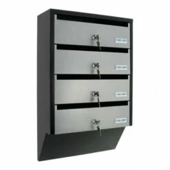Die 4-er Briefkastenanlage DEPOT 4 SILVER / BLACK besticht durch die besonders schlanke Konstruktion. Das Postgut bis Größe DIN C4 wird schräg nach unten im Briefkasten gelagert. Durch diese ausgeklügelte Konstruktion ist diese Anlage speziell in engen Stiegenhäusern extrem platzsparend. Eine Anlage verfügt über 4 Fächer für vier Parteien. Jedes Fach ist mit einem Kunststoff-Namensschild ausgestattet und ist mittels Zylinderschloss vor unbefugtem Zugriff geschützt. Zu jedem Fach werden zwei Schlüssel mitgeliefert. Durch die nach oben öffnenden Entnahmetüren ergibt sich der Vorteil, dass die Türe auch im nicht versperrtem Zustand immer am Korpus anliegt und nicht als gefährliches Hindernis nach vorne steht. Die Anlage ist für die Wandmontage konzipiert und wird mit Befestigungsmaterial für Mauerwerk geliefert. Der Korpus ist Schwarz und die Türen Silber pulverbeschichtet.