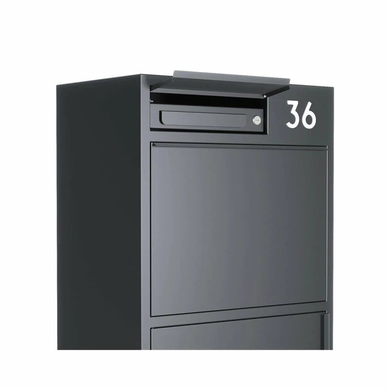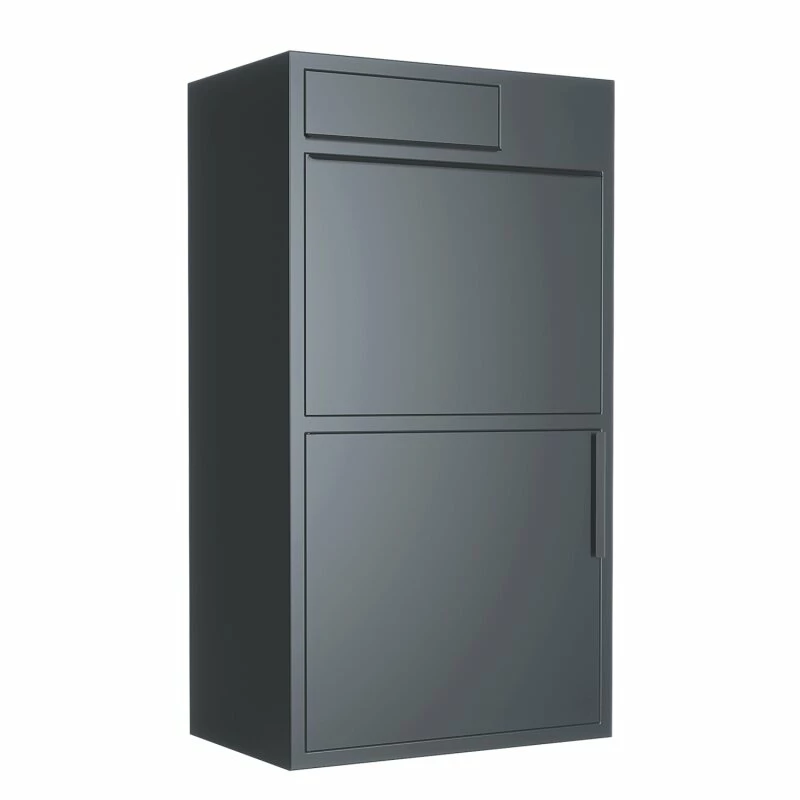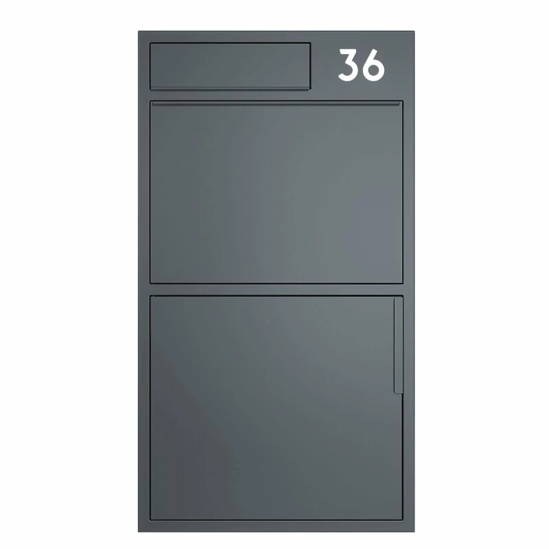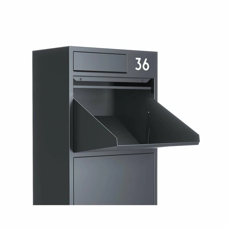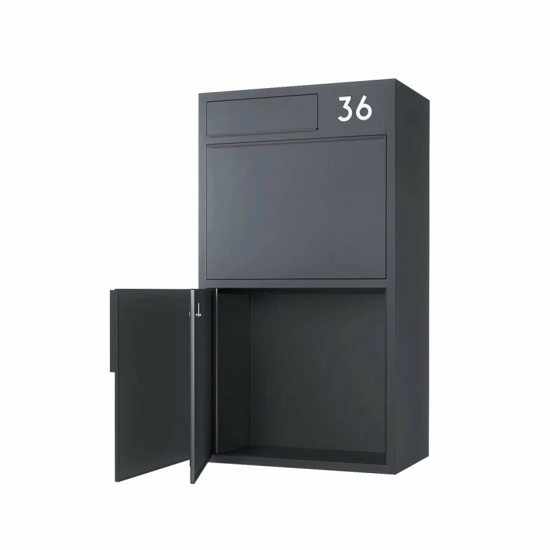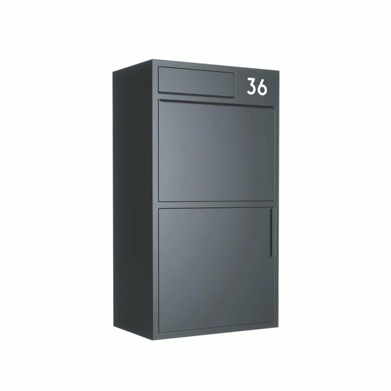 Die Paketbox aus pulverbeschichteten Edelstahl besticht mit ihrem großen Fassungsvermögen in Kombinatination mit einem eleganten schlichten Design. Dies wird durch die klaren Struckturen und der Blockform erreicht.