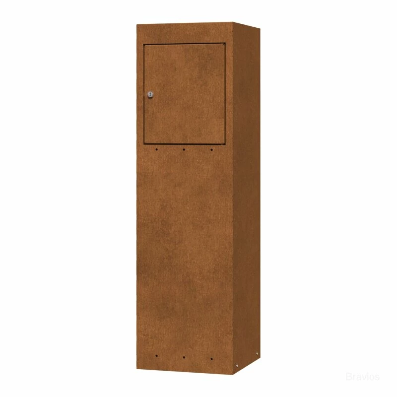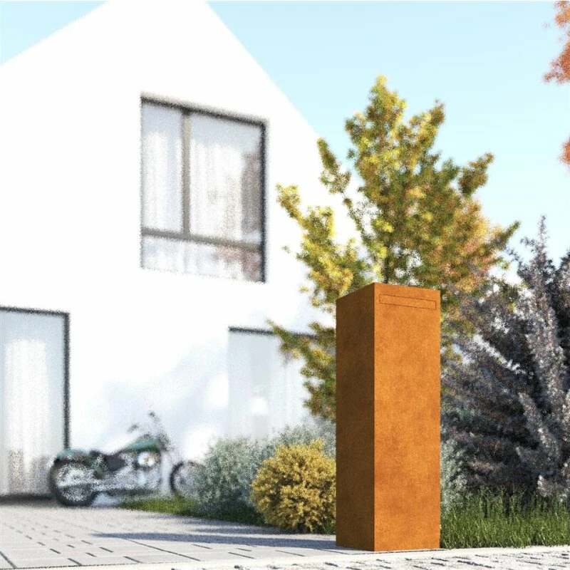 Design Standbriefkasten aus Cortenstahl. Der Standbriefkasten beeindruckt durch seine markante und schnörkellose Blockform mit einer Einwurfklappe an der Front. Durch seine natürliche und feste Rostschicht ist er ein stabiler und langfristiger Begleiter. Der Briefkasten ist ein freistehender Einzelbriefkasten zur Bodenmontage auf freier Fläche. Die Entnahme erfolgt durch die rückseitig integrierte Klappe. Durch die 2 mm dicke Materialschicht sind unsere Cortenstahl Briefkästen sehr robust.