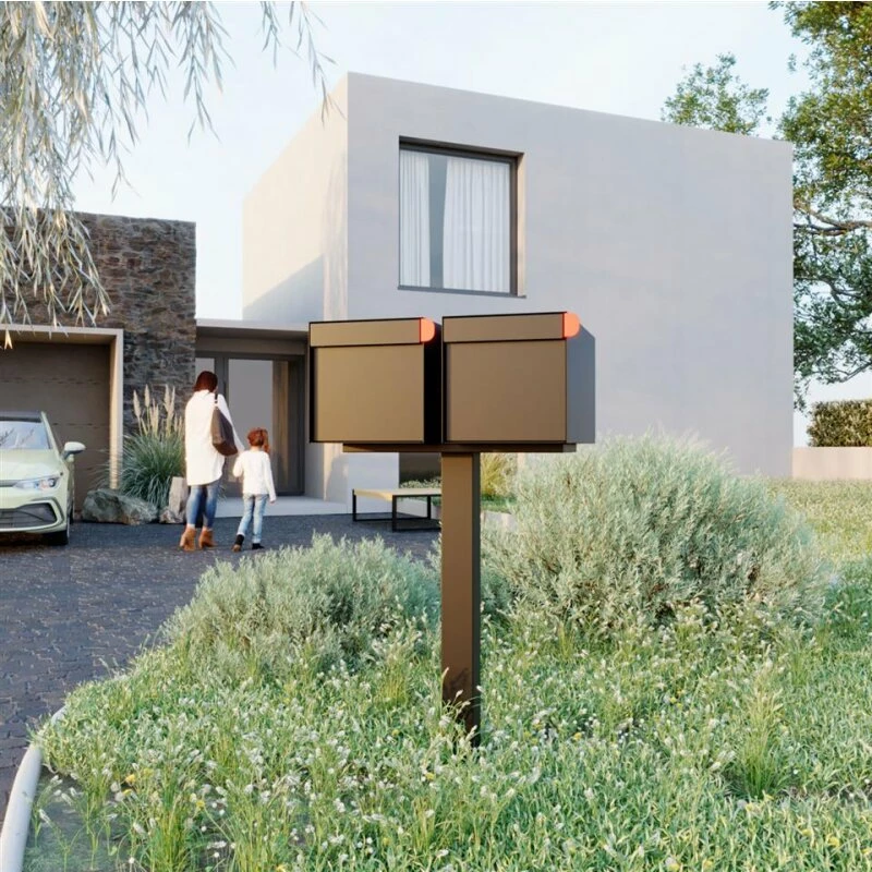 Als freistehender Dreifachbriefkasten eignet er sich für die Bodenmontage auf freier Fläche. Einwurf und Entnahme erfolgen an der Vorderseite über eine massive Frontklappe und ein dahinterliegendes Innentor mit integriertem Einwurfschlitz und Schloss. Das Besondere: Der eingriffsichere Schlitz ermöglich den Einwurf kleiner Päckchen. Die massive Frontklappe schützt das Innentor vor Witterung und lässt sich als stilistisches Element individuell gestalten.
