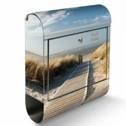 Der Edelstahl Briefkasten mit Wunschtext und Motiv Dünen bietet Ihnen mit seinem Fassungsvermögen genügend Platz auch für große A4 Sendungen. Das integrierte Zeitungsfach eignet sich hervorragend um unkompliziert die Tageszeitung zu fassen.