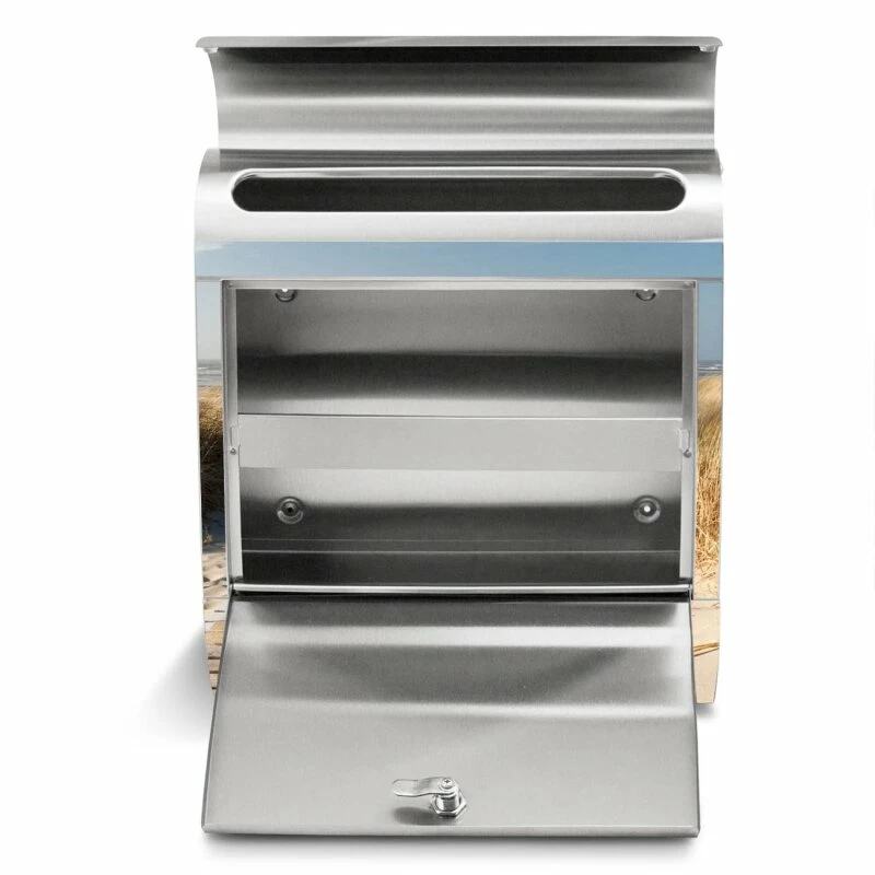 Die Größe bietet genügend Platz für Sendungen aller Art, das hochwertige Edelstahl ist rostfrei und die Motivfolie absolut wetterfest.