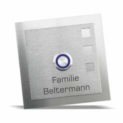 Sehr zeitvolle Haustürklingel in einem stilvollen Design. In der Mitte befindet sich ein Klingeltaster, der über eine LED-Ringbeleuchtung in verschiedenen Farben beleuchtet werden kann. Ihr Familienname wird über eine hochwertige CO2-Lasergravur auf das Klingelschild aufgebracht. Die Haustürklingel ist absolut wasserdicht und UV-beständig.