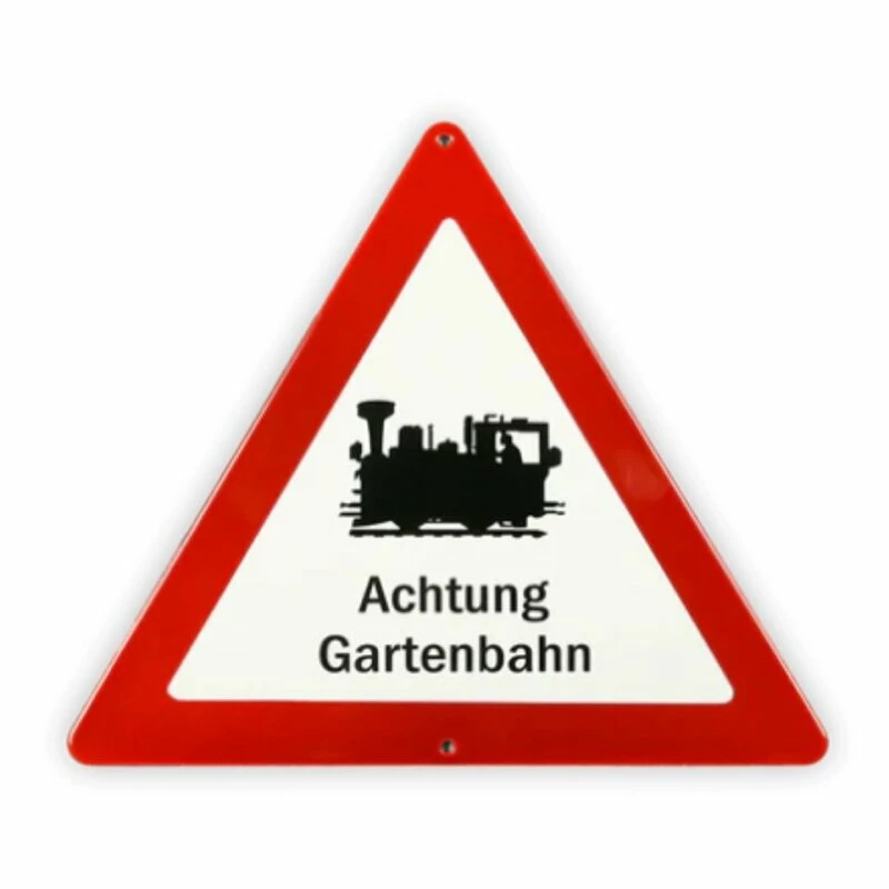 Emailschild Dreieck 25 cm, Achtung Gartenbahn