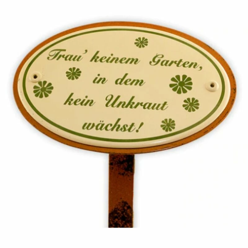 Emailschild oval, 15 x 10 cm, Trau‘ keinem Garten mit Erdspieß