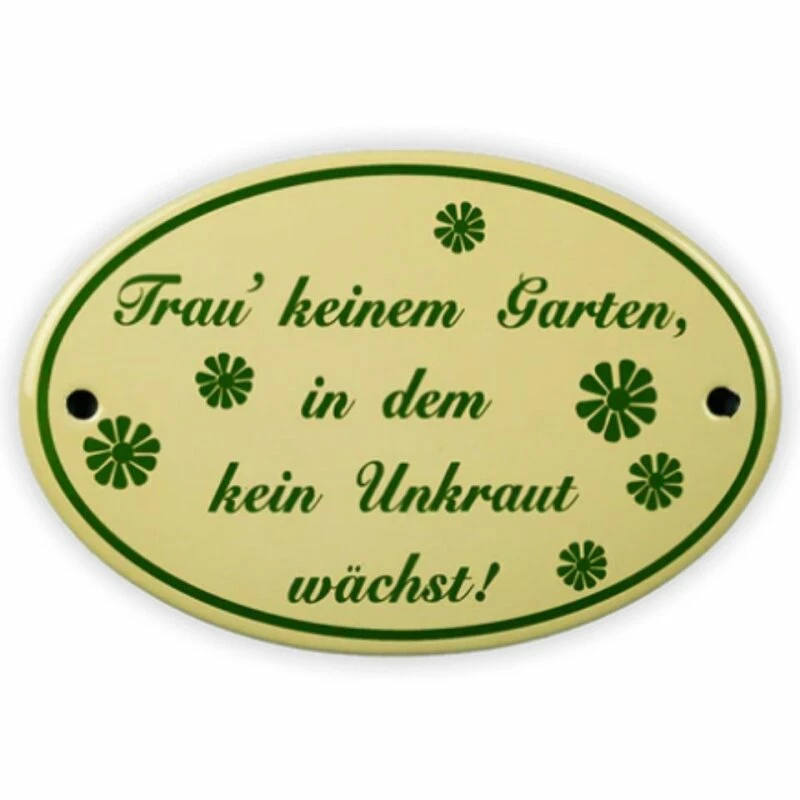 Emailschild oval, 15 x 10 cm, Trau‘ keinem Garten