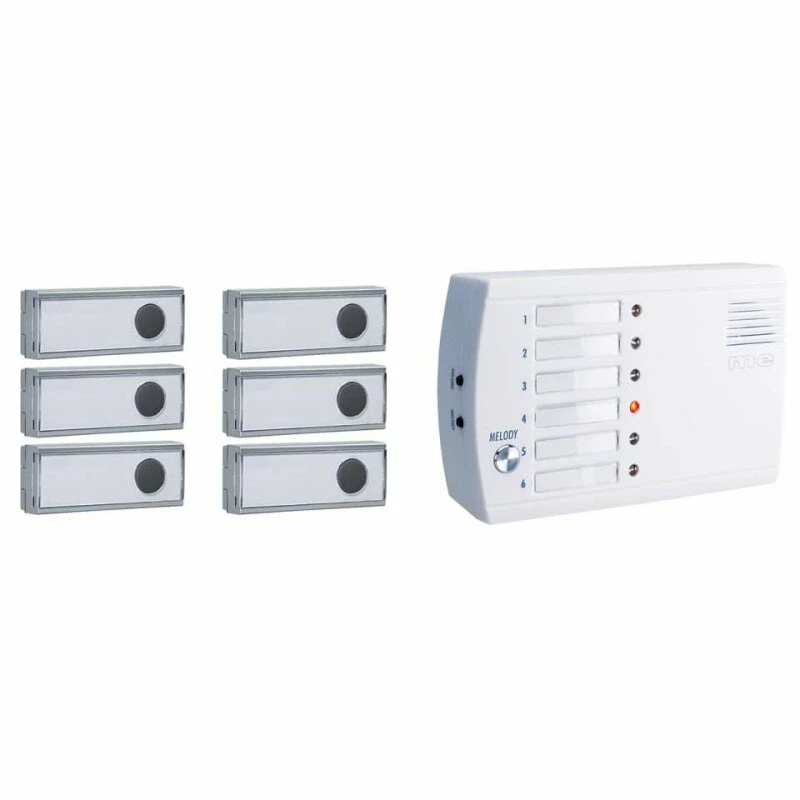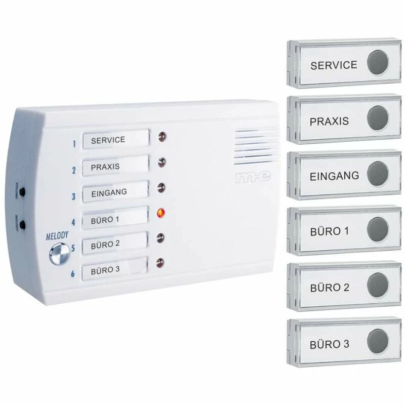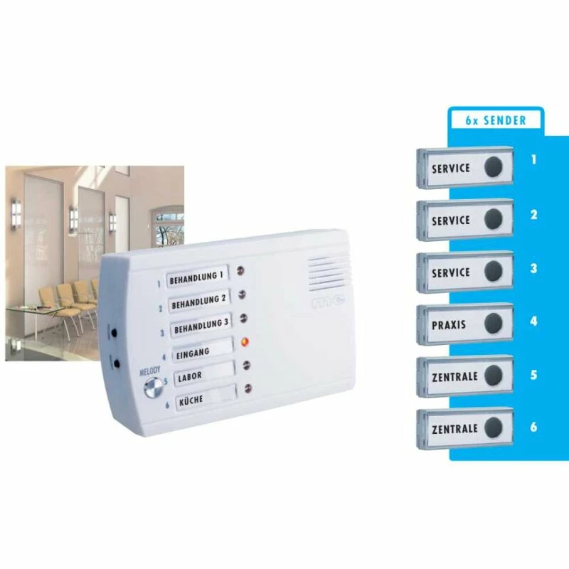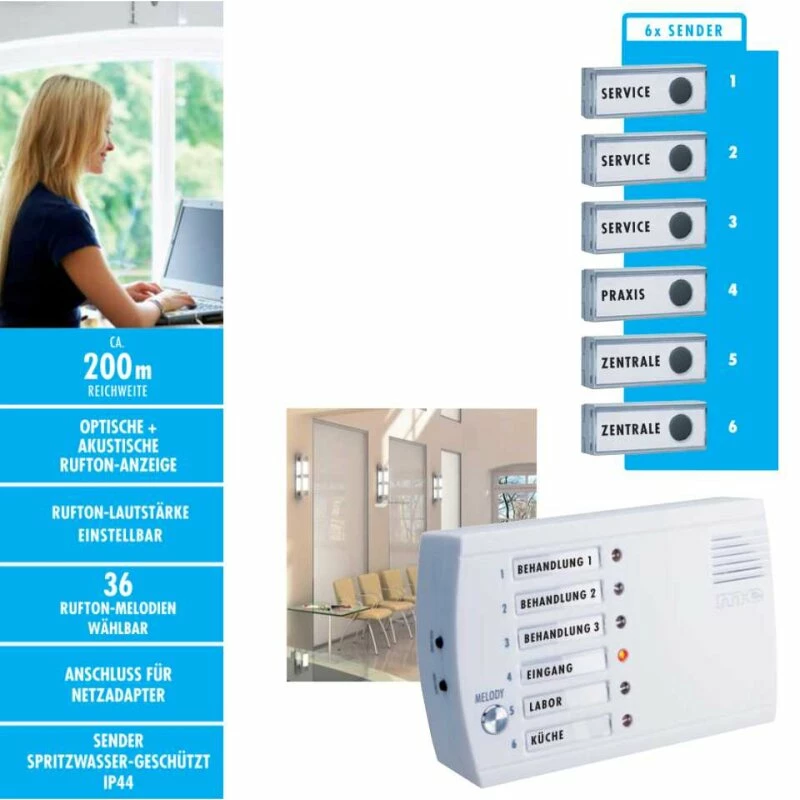Für bis zu 6 Personen, Räume oder Eingänge – Empfangszentrale zeigt optisch und akustisch den auslösenden Sender an. Ideal für Arztpraxen, Senioren- und Behindertenpflege, Pflegedienste, Kanzleien, Büros, Gastronomie etc.