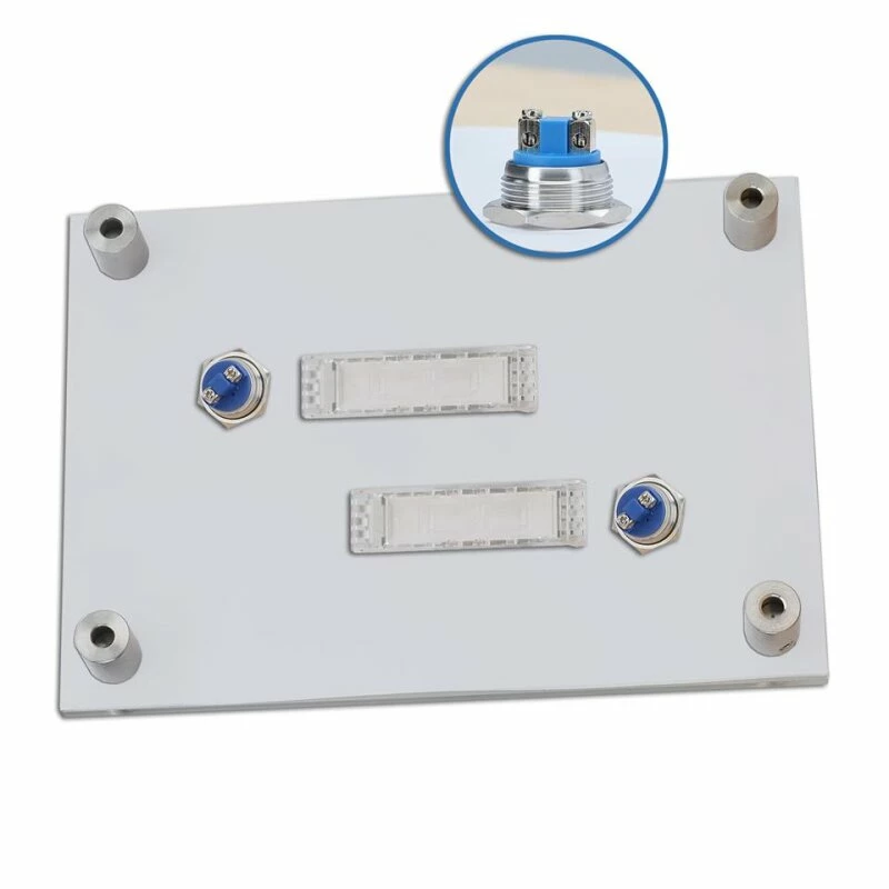 Einfach die beiden Drähte am Taster anschließen und z.B. auf der Rückseite der Acrylglasplatte ankleben