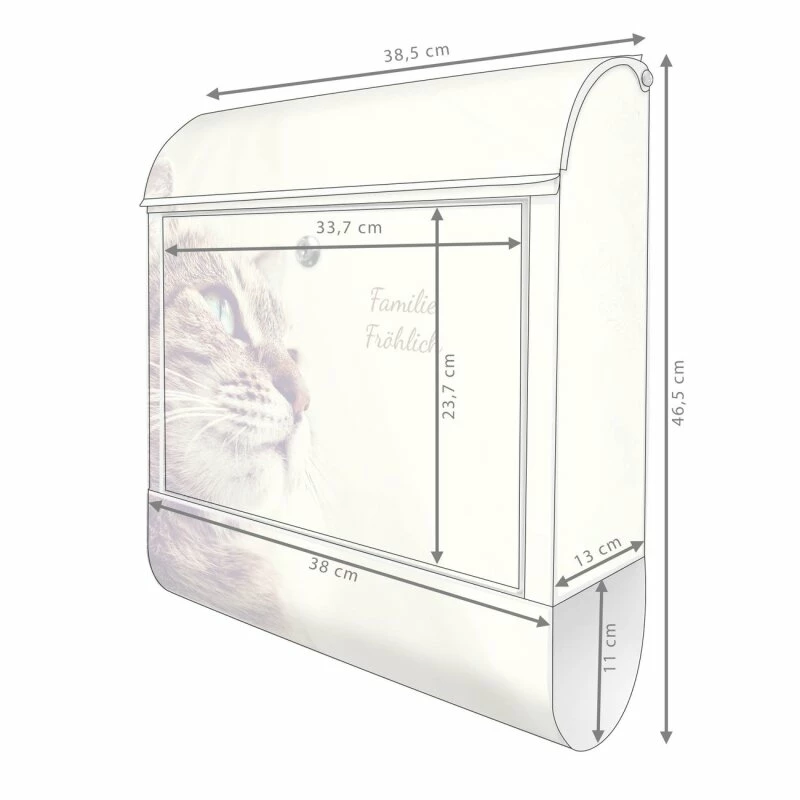 Der Postkasten besteht aus pulverbeschichtetem Stahl. Er ist 38x47x13cm groß. Das Motiv besteht aus einer wetter- und UV-resistenten Folie, die mit einem Schutzlaminat überzogen ist, sodass der Briefkasten zusätzlich vor Kratzern geschützt ist. Der Briefkasten wird mit Montagematerial, zusätzlich zwei Schlüssel sowie einer Bohrschablone geliefert.