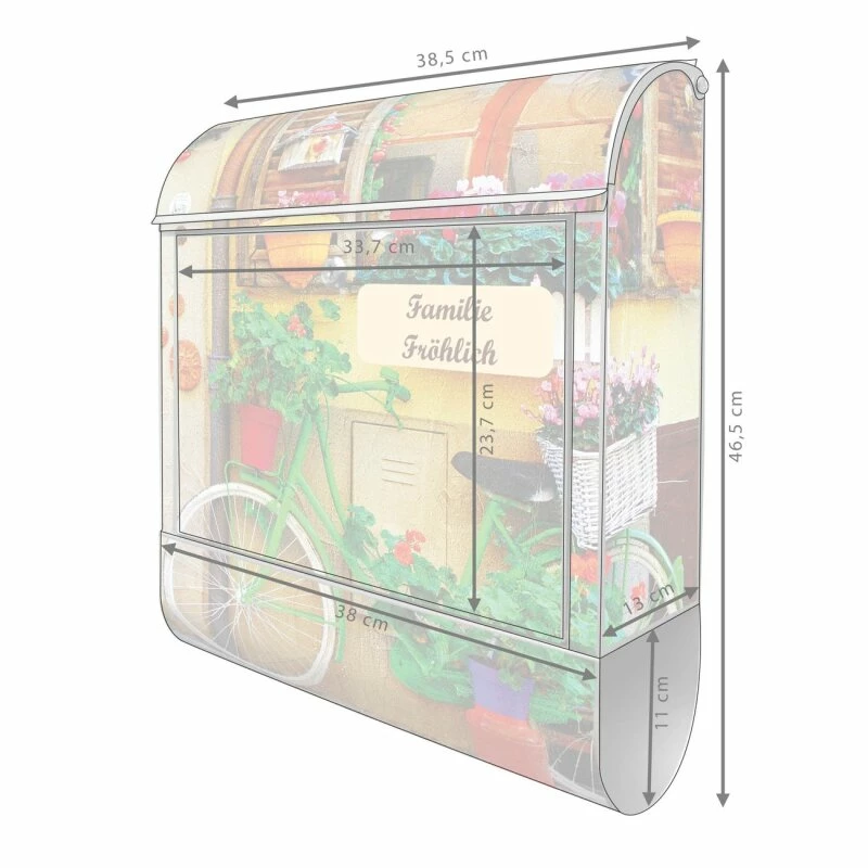 Der Briefkasten mit Motiv Grünes Fahrrad bietet Ihnen mit seinem Fassungsvermögen genügend Platz auch für große A4 Sendungen. Die integrierte Zeitungsrolle eignet sich hervorragend, um unkompliziert die Tageszeitung zu fassen.