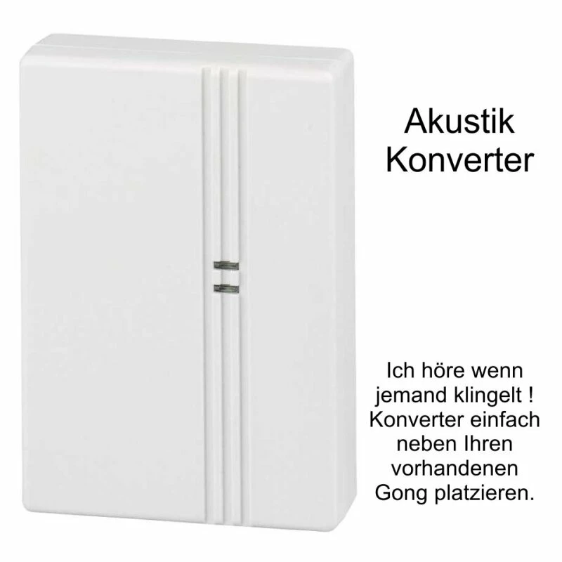 Ihr eigener Gong ist zu leise ? Platzieren Sie einfach den Akustikkonverter rechts neben Ihrem jetzigen Gong. Klingelt jetzt jemand an der Haustüre, sendet der Akustik-Konverter per Funk zusätzlich das Signal an den Empfänger.