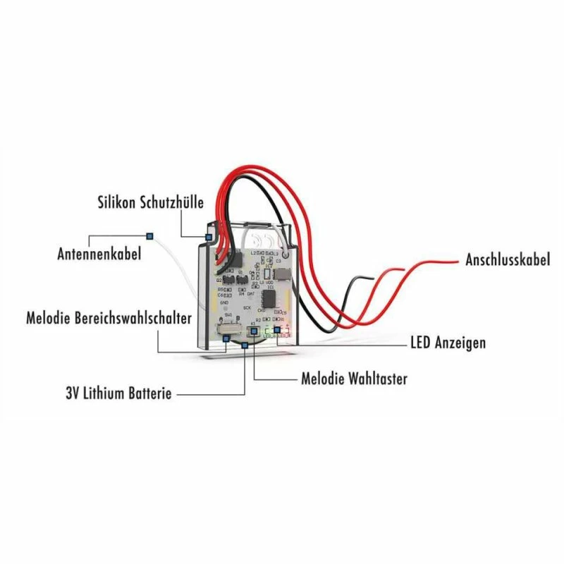 Der Micro-Funk-Converter (Sender) wird direkt an der Klingelleitung oder versteckt im Gehäuse Ihres vorhandenen Gongs angeschlossen und sendet ein Funk-Signal an Türglocken-Empfänger. Der besondere Vorteil ist hier das der Micro-Funk-Converter in alle herkömmlichen Unterputzdosen verbaut werden kann.