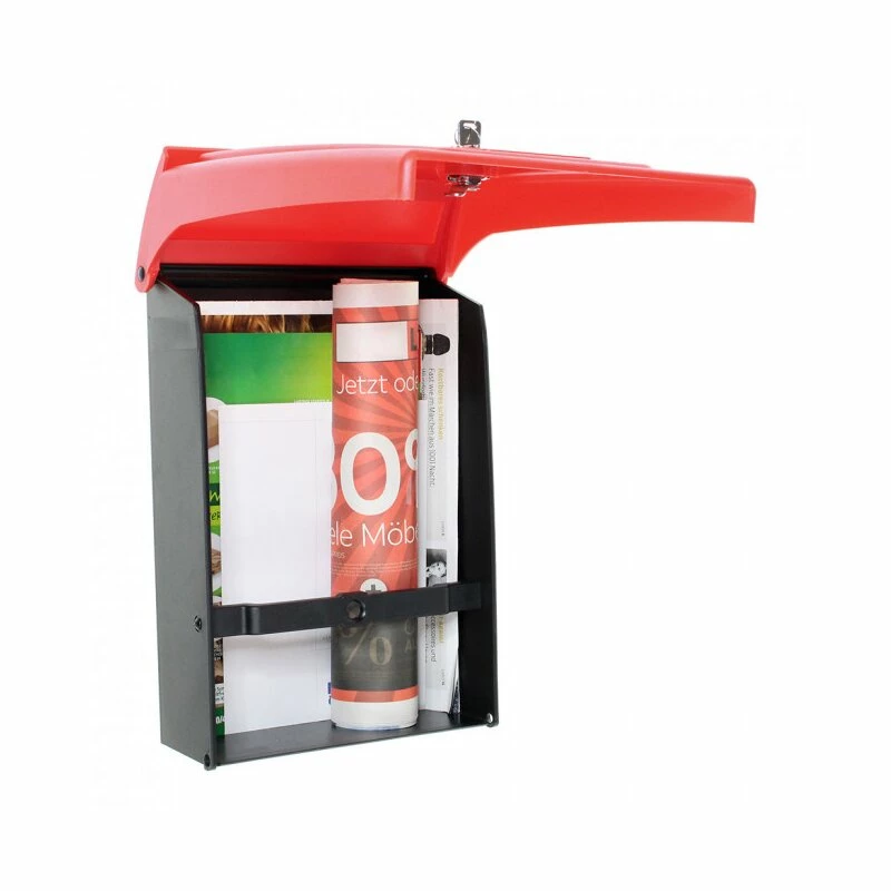 Die Posta Mailbox Black-Red aus UV-beständigem Kunststoff wird der neue Blickfang Ihres Zuhauses. Die kräftige Farbkombination rot/schwarz fällt sofort auf. Wenn Sie das Zylinderschloss öffnen (inkl. 2 Schlüssel), geht die Tür nach oben auf. Die darin befindliche Post wird mittels eines Postbefestigungshalters festgehalten, sodass sie nicht herausfallen kann. Das für die Montage benötige Befestigungsmaterial liegt bei.