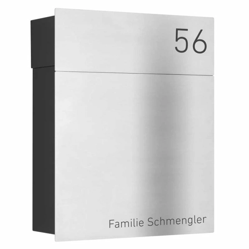 Premium Briefkasten Front Edelstahl – Korpus schwarz mit Beschriftung