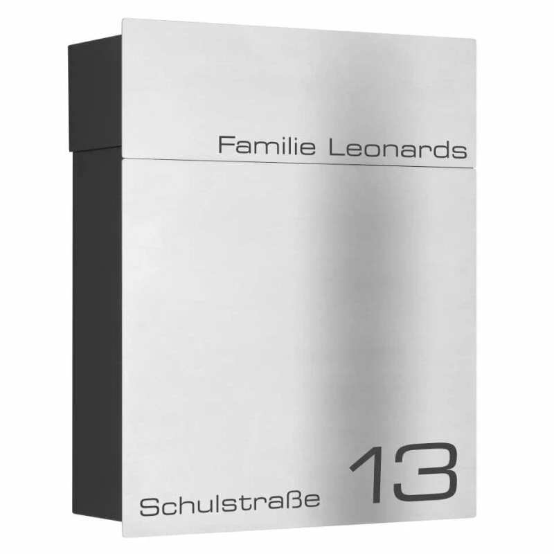 Premium Briefkasten Front Edelstahl – Korpus schwarz mit Beschriftung