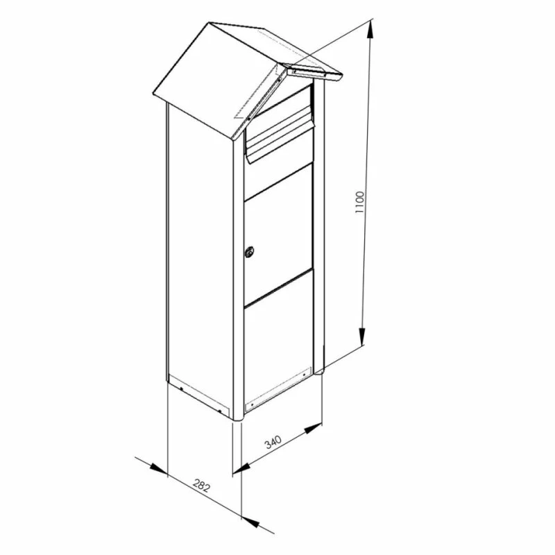 Hübscher Paketbriefkasten mit Liebe zum Detail. Die große Einwurfklappe vorn nimmt Post