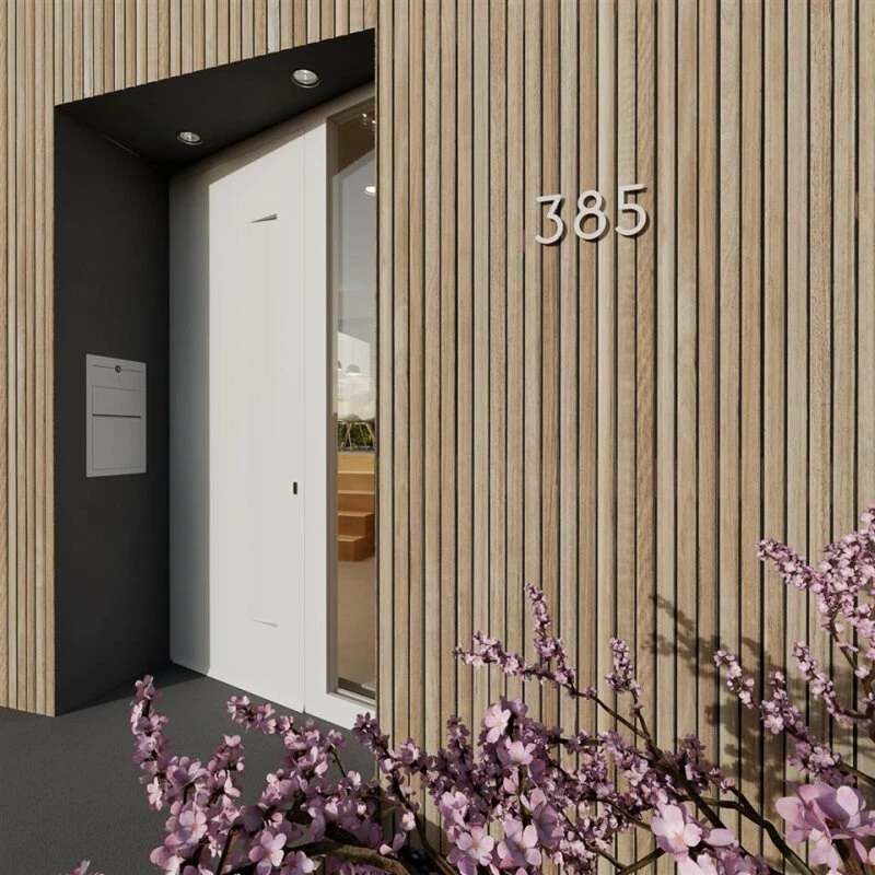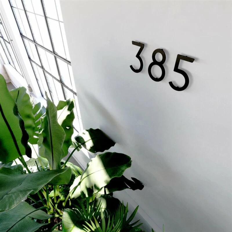 Moderne Hausnummer aus pulverbeschichtetem Edelstahl zur Wandbefestigung. Die Befestigung der Hausnummer ist auf der Vorderseite nicht sichtbar, sodass das Design nicht unterbrochen wird. Die Hausnummern werden mit rückseitig angebrachten Bolzen montiert (Länge 60 mm) Die edlen Hausnummern sind in 3 modernen Farben erhältlich.