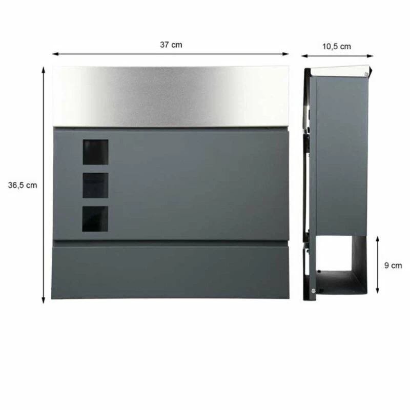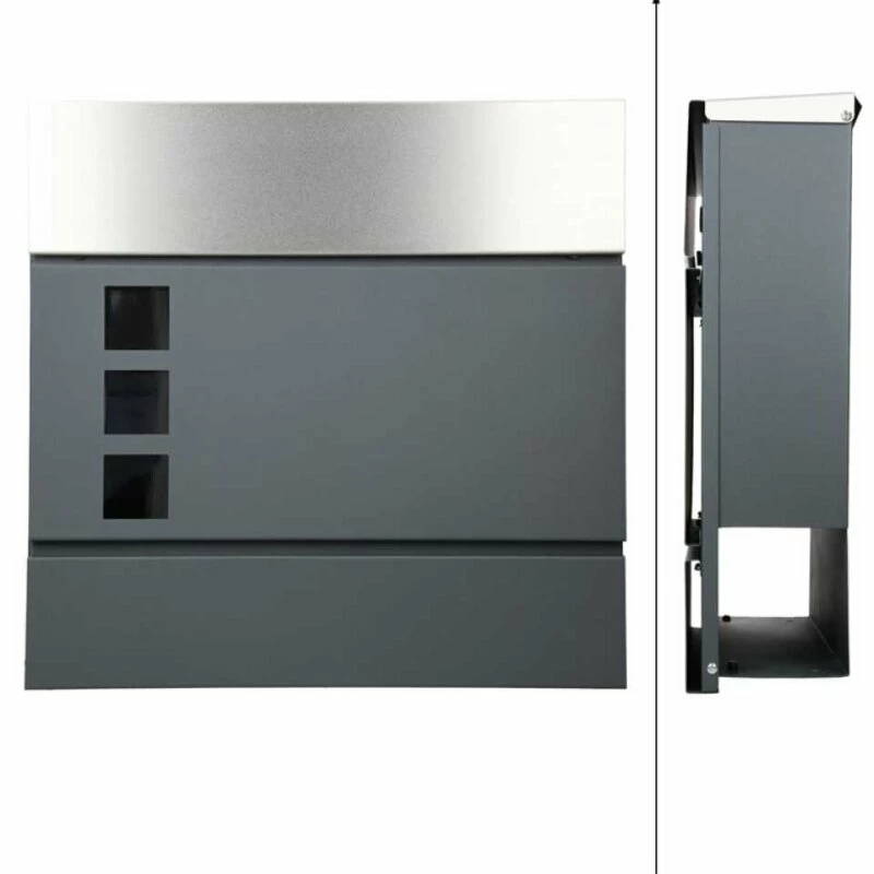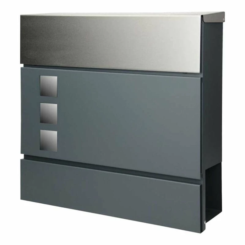Designer Wandbriefkasten mit drei Sichtfenster, die Front aus Edelstahl, Korpus in der Farbe Anthrazit mit intergriertem Zeitungsfach / Zeitungsrolle.