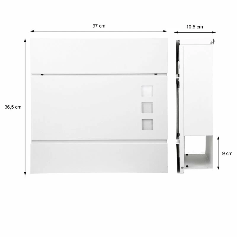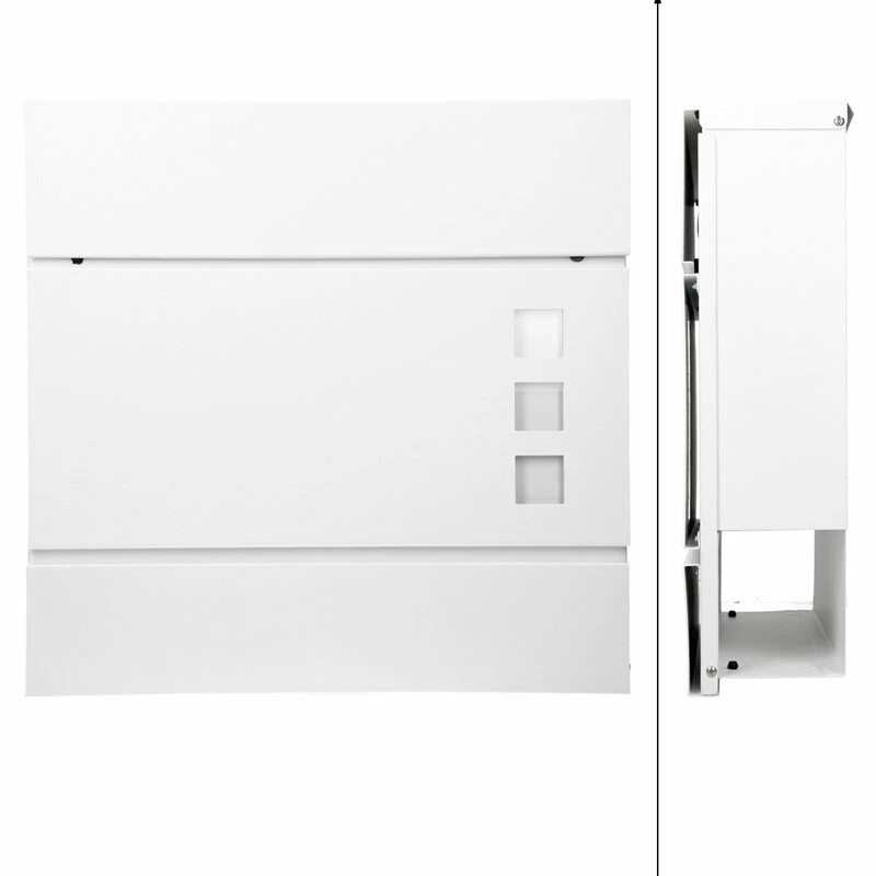 Designer Wandbriefkasten mit drei Sichtfenster, die Front aus Edelstahl, Korpus in der Farbe RAL 9010 verkehrsweiss mit intergriertem Zeitungsfach / Zeitungsrolle.