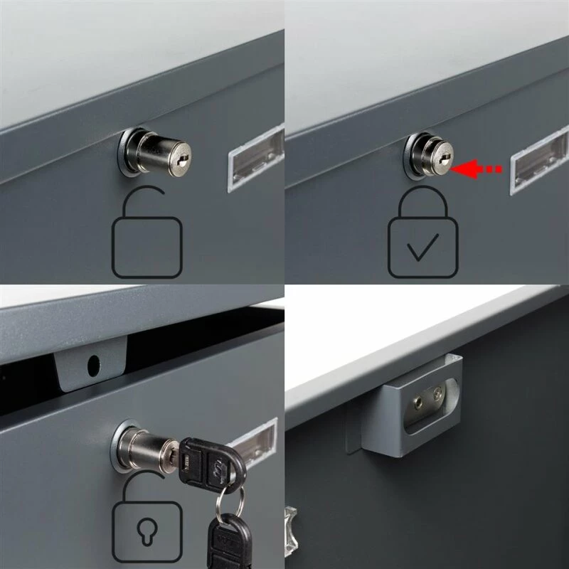 Das Schloss verfügt über eine Einrastfunktion, sodass Pakete sicher zugestellt werden können. Hierfür wird das Schloss mittels Schlüssel entriegelt, sodass sich das Schloss nach Außen schiebt. In dieser Position kann der Deckel der Paketbox geöffnet und Pakete hineingelegt werden. Anschließend wird der Deckel geschlossen und das Schloss hineingedrückt. Auf diese Weise wird der Deckel verriegelt, das Paket ist gesichert und die Box kann nur noch durch den Schlüsselinhaber geöffnet werden.