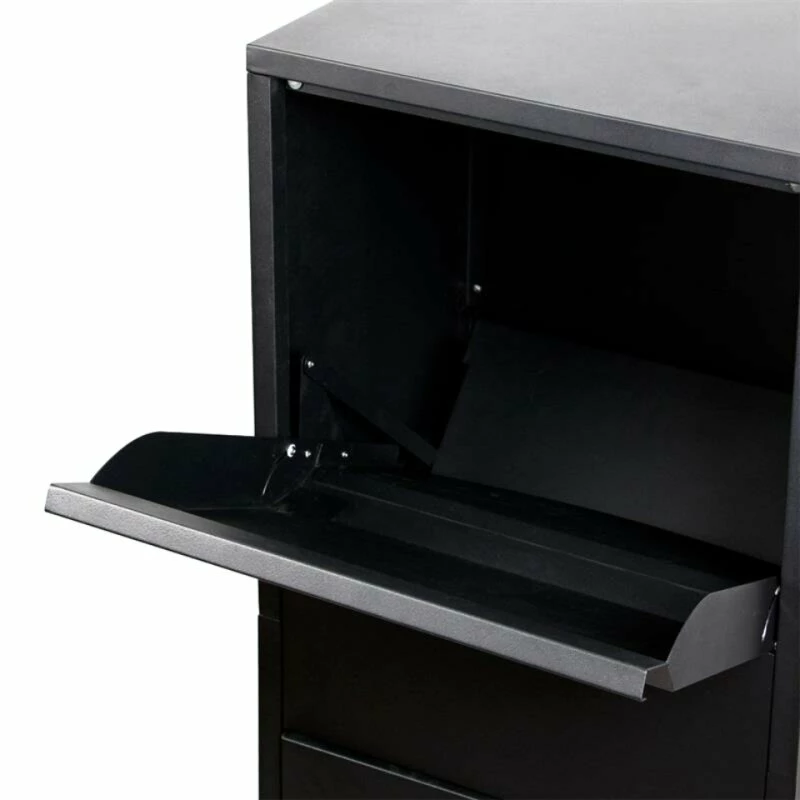 Mit dieser schwarzen Paketbox können Sie Päckchen und andere Sendungen annehmen, ohne Zuhause zu sein. Sendungen, die größer als normale Briefe sind, passen in die meisten Briefkästen nicht hinein. Anders bei der Paketbox, da sie über ein spezielles Einwurfsystem für Pakete verfügt. Die obere Einwurfklappe wird geöffnet und das Paket auf den Zwischenboden gelegt. Wenn die Klappe geschlossen wird, öffnet sich der Zwischenboden und das Paket fällt in den unteren Bereich der Paketbox. Sobald das Paket im unteren Bereich der Paketbox liegt, schließt sich der Zwischenboden wieder und ein weiteres Paket kann in die Box gelegt werden. Um die Pakete zu entnehmen, entriegeln Sie das Schloss im unteren Segment der Paketbox und öffnen die untere, große Klappe. Nun können Sie problemlos Ihre Sendungen herausholen.