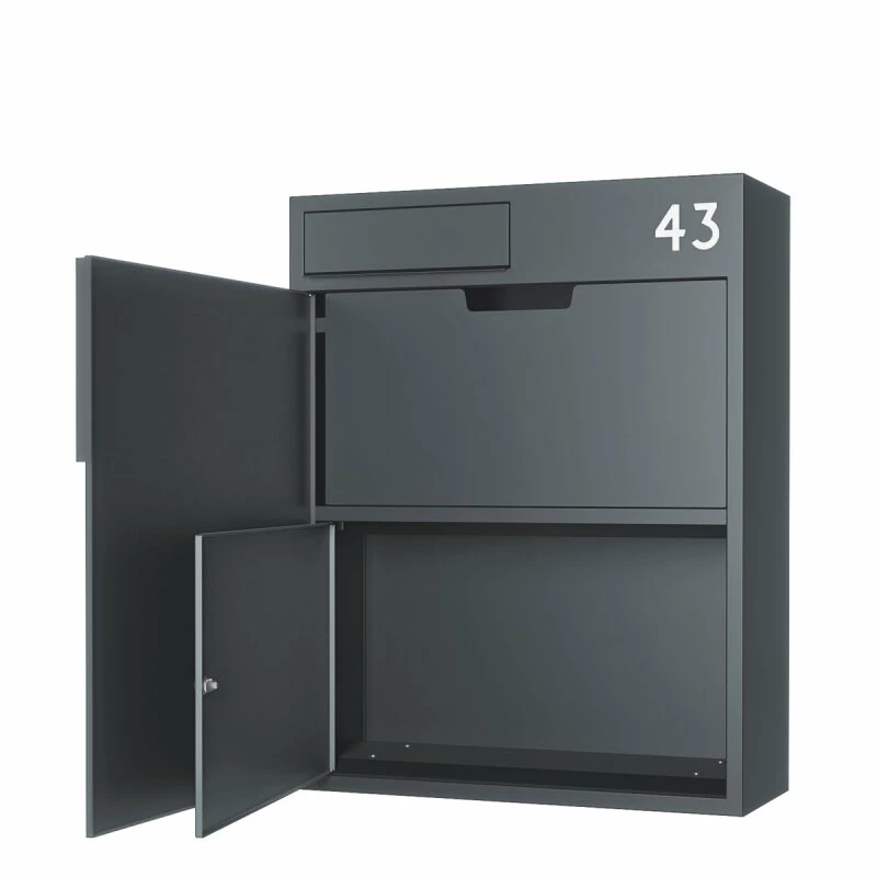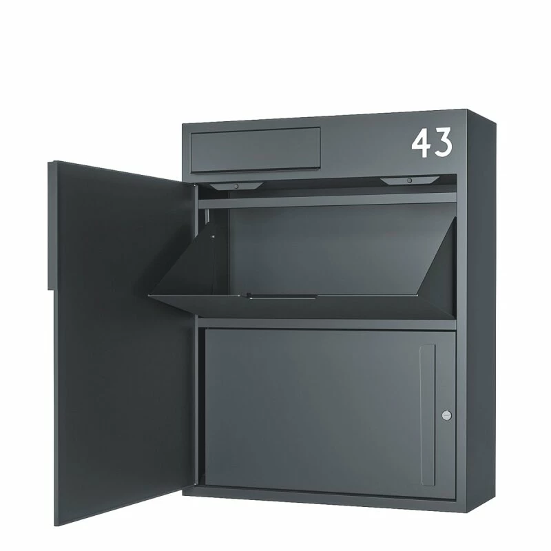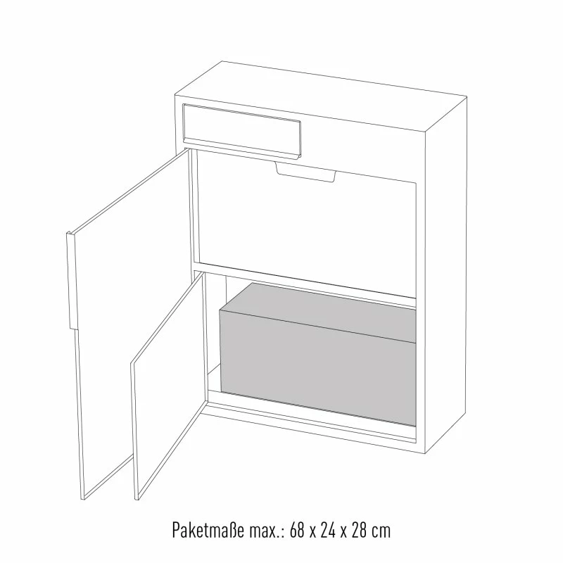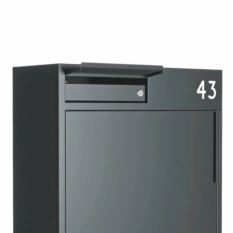 Die Paketbox ist ein freistehender Einzelbriefkasten mit integriertem Paketfach zur Bodenmontage.