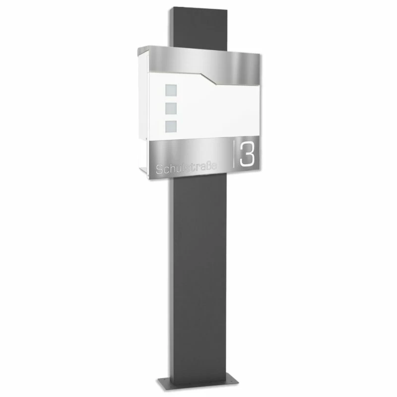 Säulenbriefkasten inkl. Zeitungsfach RAL 9016 weiß mit Edelstahl Laser Namensblende