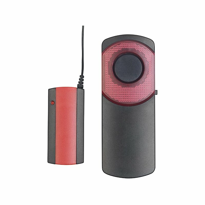 Klingel-Einheit mit Signal-LED, Befestigungs-Clip (z.B. für Gürtel oder Hosentasche) und Schiebe-Schalter: Alarm/Klingel/aus
