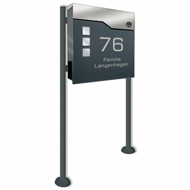 incl. Standfuß in ANTHRAZIT GRAU RAL 7016 für die freistehende Montage. Briefkasten mit Ständer zur freistehenden Montage. Die Montage funktioniert kinderleicht über Dübel, welche durch den Standfuß im Boden verankert werden. So lassen sich das Aussehen und vor allem der Platz, an welchem der Briefkasten aufgestellt wird, einfach an die eigenen Bedürfnisse anpassen. Der Gravurtext kann von Ihnen frei gewählt werden. Diesen tragen Sie bitte in das Bemerkungsfeld zur Beschriftung ein.