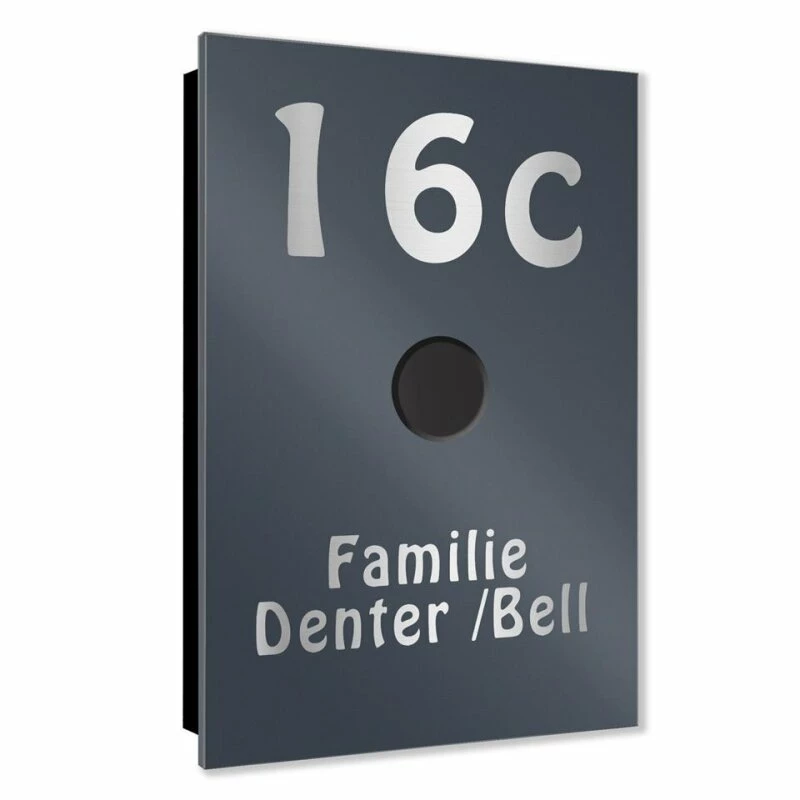 Die Schriftfarbe ist schwarz in der Edelstahlversion. Bei pulverbeschichteten Typen ist diese edelstahlfarben.
